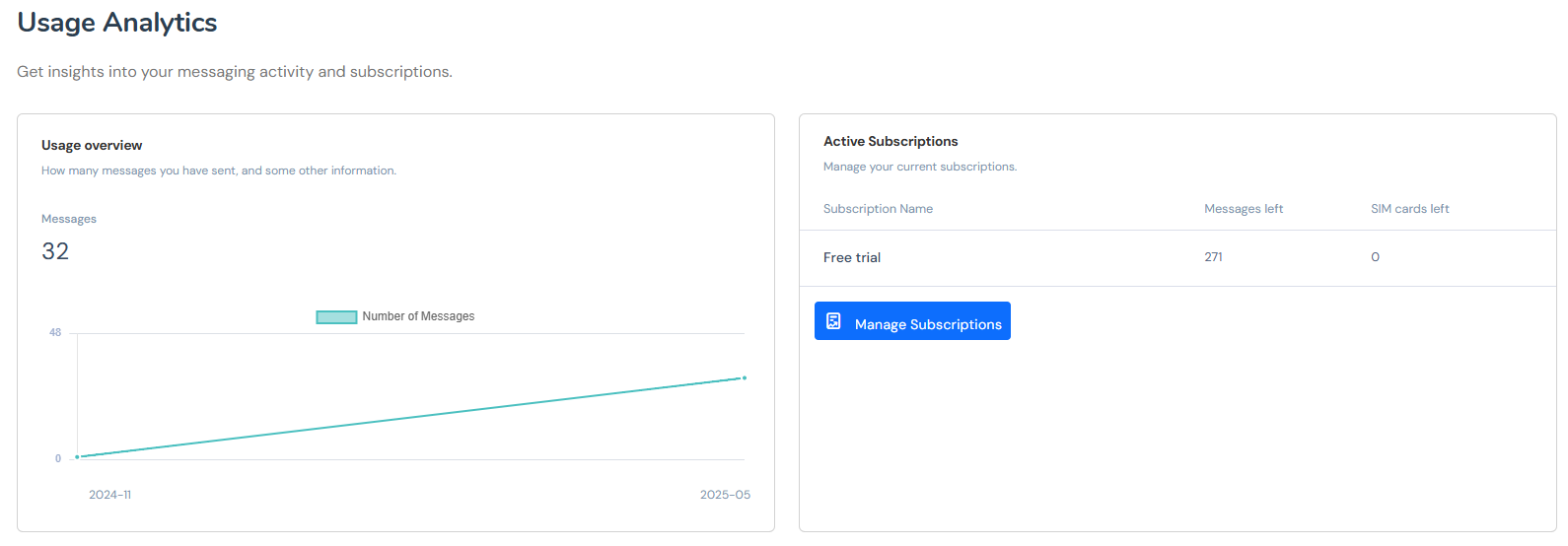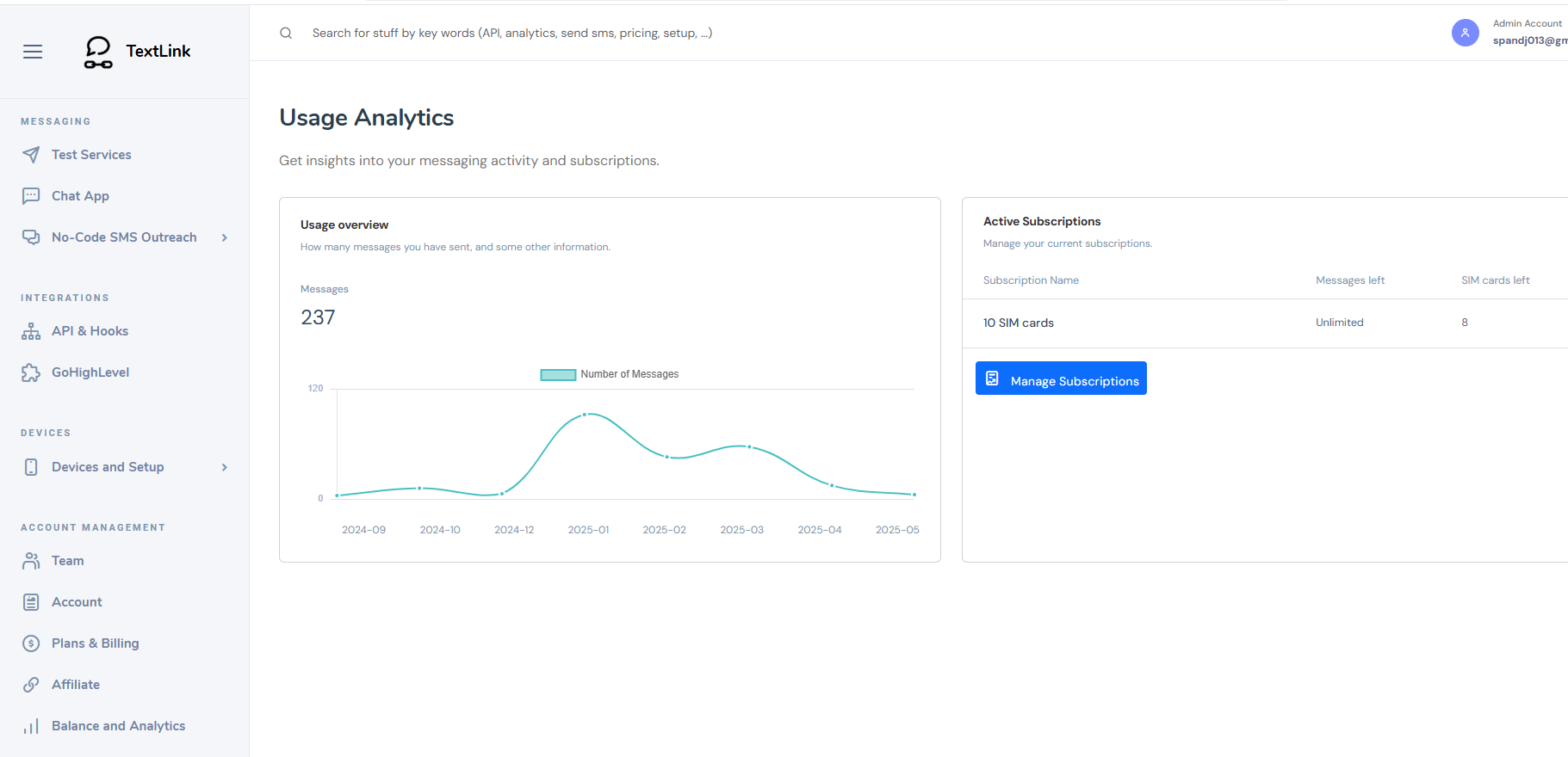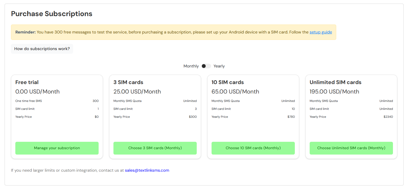 Manage and upgrade your current billing plan. You have 300 free SMS to test out TextLink, but are limited to 1 SIM card for testing purposes. If you want to have more SIM cards, or when you reach your limit, you will need to upgrade your plan to continue using TextLink.