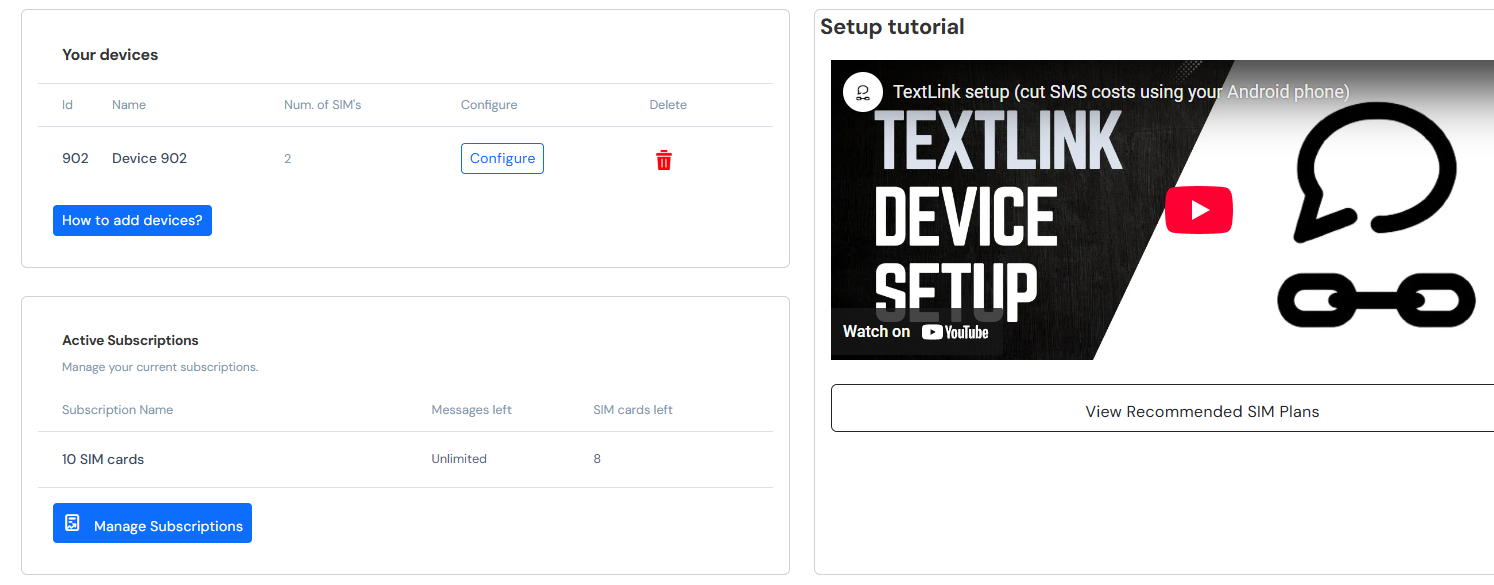 You can learn how to set up your Android device to work with TextLink on the **Tutorial** page, and on the **Dashboard** page, you can manage your devices, delete the unused ones, and configure which destinations can your SIM cards send messages to.
