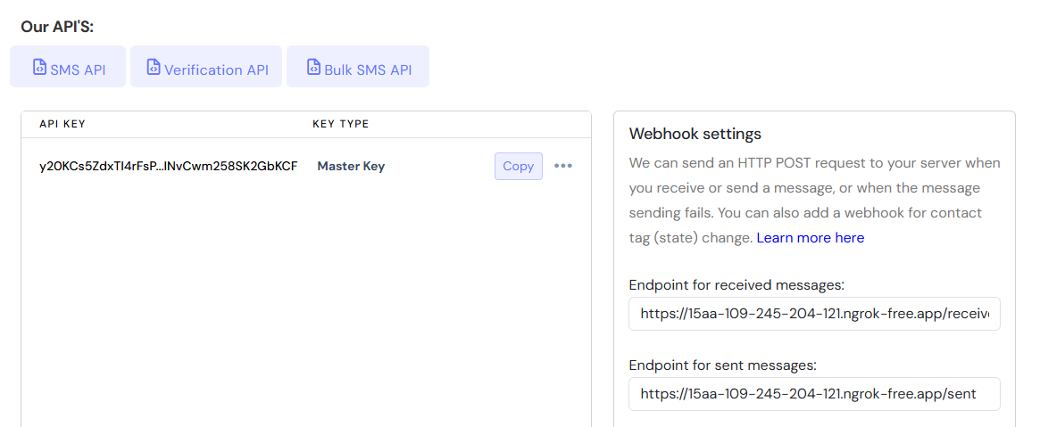 Manage your API key and webhooks for receiving SMS, tracking SMS status and tracking contacts' tags.