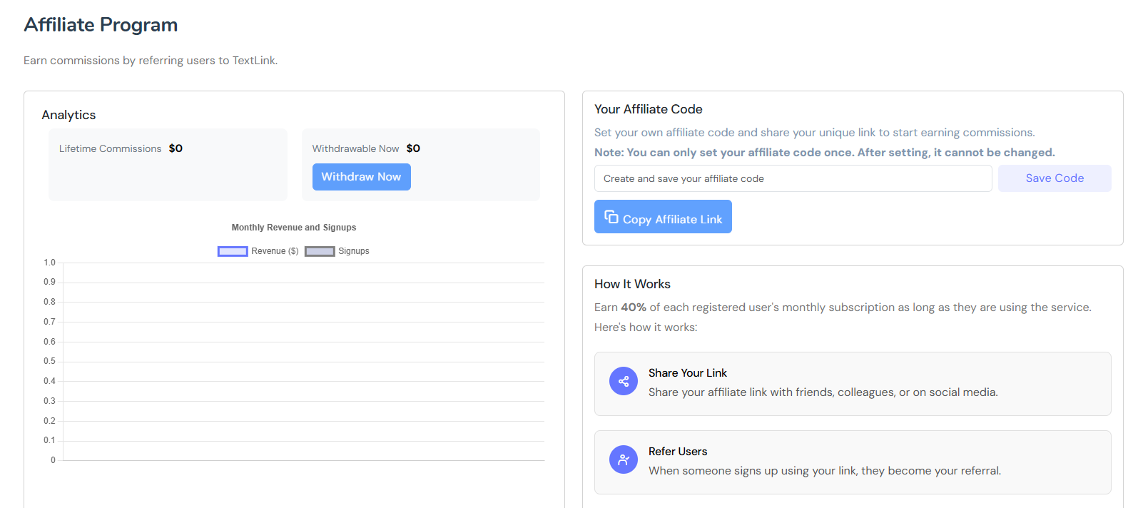 Create your invite code, and invite someone to use TextLink. You will earn 40% of subscriptions for everyone that uses your invite code.&#x20;